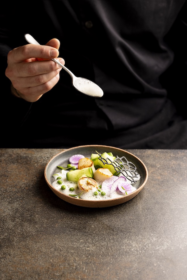 Just before serving, melt the butter in a hot pan and brown the scallops on both sides. Season with fine salt and freshly ground pepper. Arrange the scallops and vegetables on serving plates.